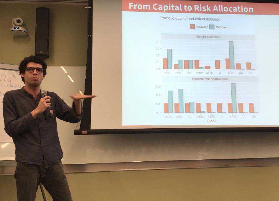 Part of Vincent’s talk was a good introduction to this talk (e.g. portfolio optimization as a convex optimization problem). José is a PhD student of Prof. Daniel Palomar at HKUST. The idea of risk parity portfolios is to allocate risk rather than capital. Quite often practitioners use an approximation of the original risk parity problem by considering the covariance matrix to be diagonal which leads actually to the inverse volatility portfolio. However, it discards important information: correlation of the returns. During this talk, we learn that there are actually many variants of the risk parity portfolios, some of which include expected returns in their objective function. Open source code is available on Daniel Palomar’s GitHub with contributions from José. After the talk, members of the audience asked questions about the now quite famous Hierarchical Risk Parity by de Prado. It happens that I experimented quite a bit with this HRP portfolio construction method (cf. these blogs HRP Part I, HRP Part II, HRP Part III). Questions were along the lines “which one is better in practice?”. Hard to say. Most of the studies reach a conclusion, if any, based on a particular dataset. Results depend too strongly on a given universe of assets and time frame to be of scientific value. There is no strict dominance of a particular method in general, or at least to the best of my (and many) knowledge. To illustrate the extent of the debate, some researchers and practitioners don’t feel complex portfolio construction is worth the effort and advocate for very simple allocation such as equal weighting: How Inefficient is the 1/N Asset-Allocation Strategy? Answer from the paper: It is not. Inverse volatility is also a good simple candidate. Digression I think it is good practice to test, understand and compare these portfolio construction methods on simulated data. First, on very simple cases like samples from multivariate Gaussians, then adding some tails in the margins and/or in the dependence structure (cf. copulas). Comparison between several methods can be done more seriously. However, it is not clear how well results and conclusions will generalize to real data as the generative models to do these Monte Carlo studies may be too simplistic and far from reality. This motivated my research on using GANs (or VAEs) to sample realistic correlation matrices (cf. this web app and this blog), and thus more realistic multivariate distribution of returns. I should follow-up with a comparison of these portfolio construction methods using CorrGAN, and eventually present it at the meetup if results are convincing.