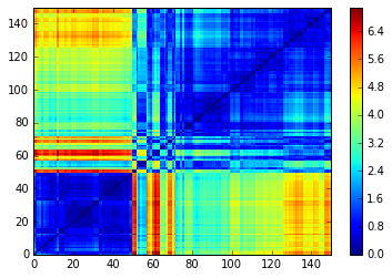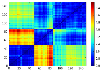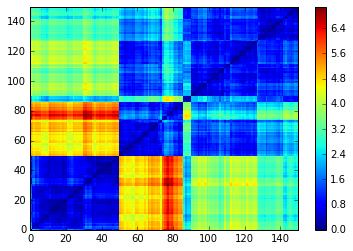 The dataset contains 150 points in R^4 (150 flowers described by 4 features). Using pdist we can compute a 150 x 150 distance matrix which is displayed below.