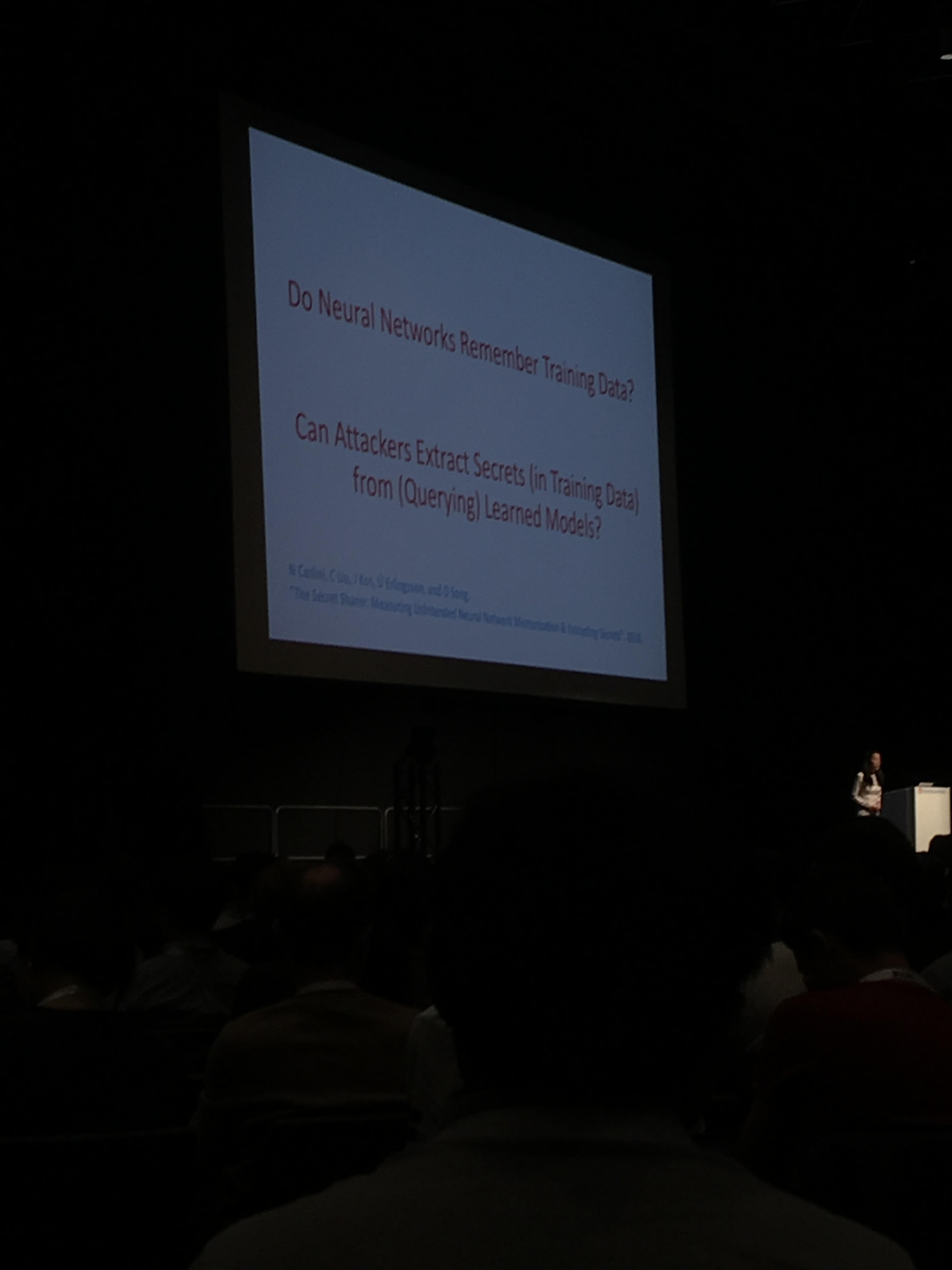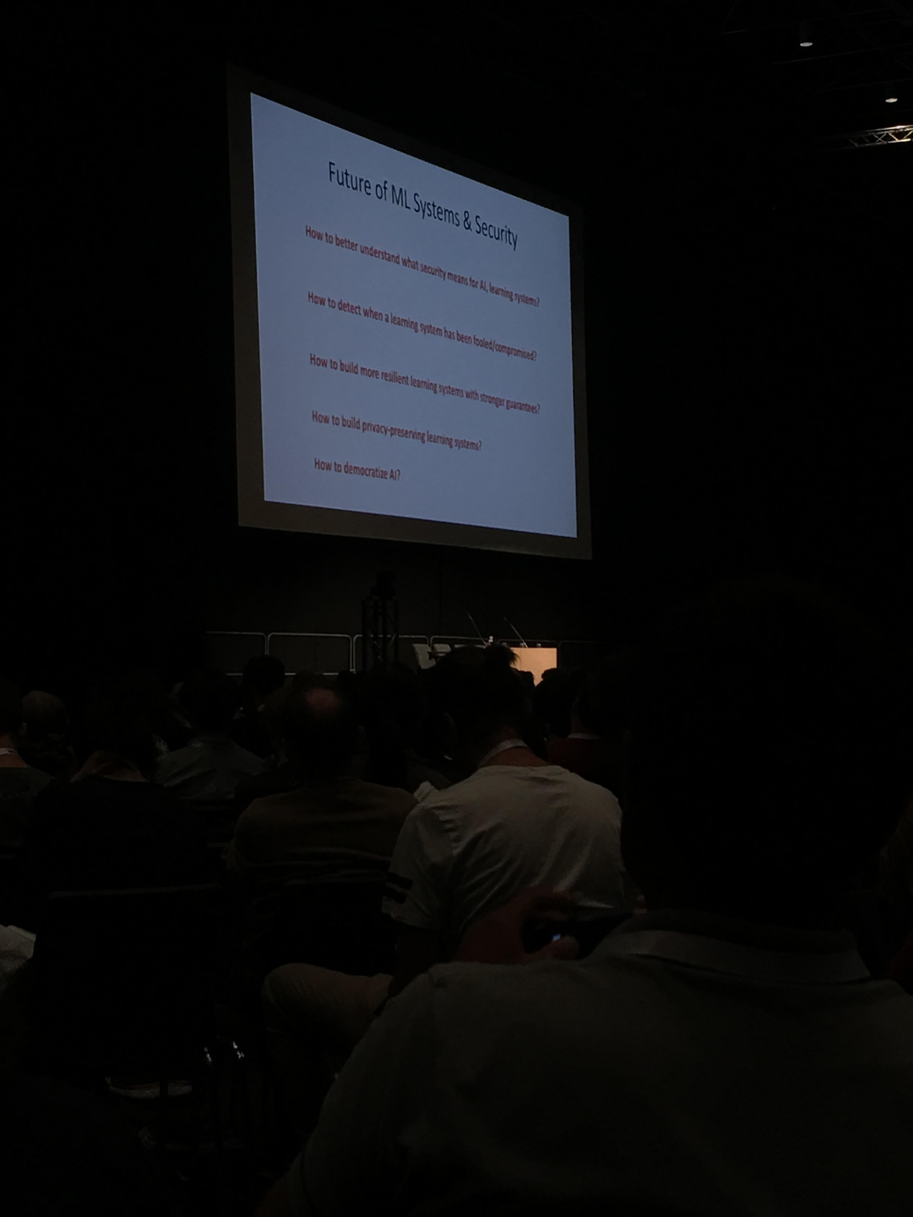 The main conference began today (yesterday was the Tutorials). It started by an invited talk from Prof. Dawn Song on ``AI and Security: Lessons, Challenges and Future Directions’’, followed by the best paper award presentation on Obfuscated Gradients Give a False Sense of Security: Circumventing Defenses to Adversarial Examples.