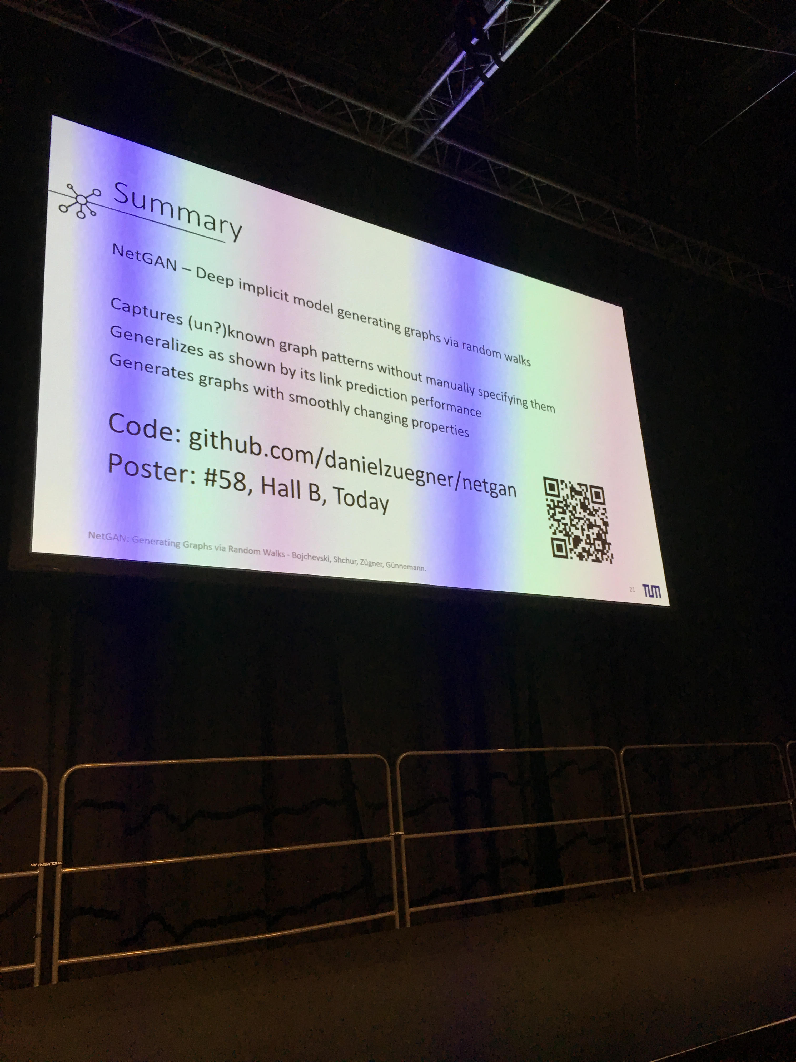 • Super clear presentation. A GAN that can generate realistic graphs from a given graph in input. Can be tweaked to several graph having the same nodes. Gave me some interesting research ideas on financial correlations, their stylized facts, and the latent embedding space. More on that later. The speaker presented me its poster: Very didactic presentation. Code available on GitHub.