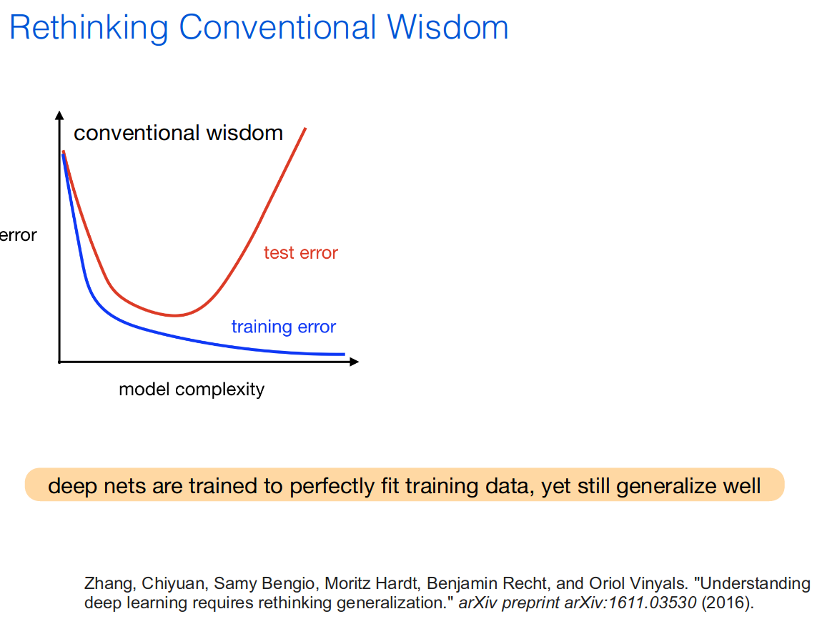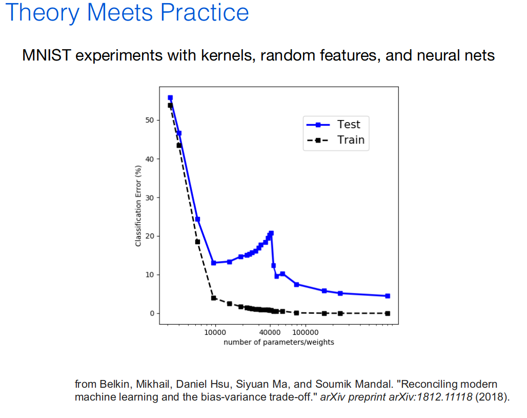 - I attended this tutorial as I find that Active Learning is highly relevant for a practitioner. Active Learning aims to train machines with less labeled data and less human supervision. What not to like? If you are someone who spent countless hours labeling with various tricks some niche data, you will understand. Active Learning gathers a set of techniques and theories on how machine can automatically and adaptively selects the most informative data for labeling. Thus, the human can only focus on the data points that ‘matter’ for improving the machine learning model. Baseline for this field is the ‘no labeling strategy’, that is sample at random (uniformly) points to label. An active strategy would be to present the labeler with points that are near the best decision boundary given the points labeled so far. Prof. Nowak mentioned Hierarchical Clustering as a way to do some active learning, idea coming from an ‘old’ paper I wasn’t aware of. I used similar techniques (hierarchical clustering and flat clustering for labeling), which are quite natural ideas, in the past but without much theoretical understanding. I’ll look into the details. More thought provoking were the slides 9-12 of part 4 of the tutorial. Basically, in the classic standard textbooks on statistical learning you are told quickly about the bias-variance trade-off, and you can see the following picture everywhere: