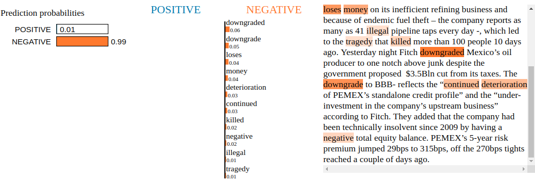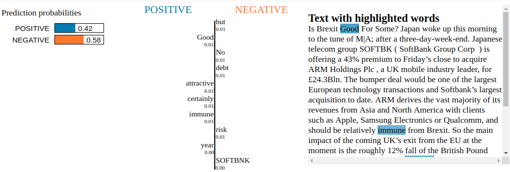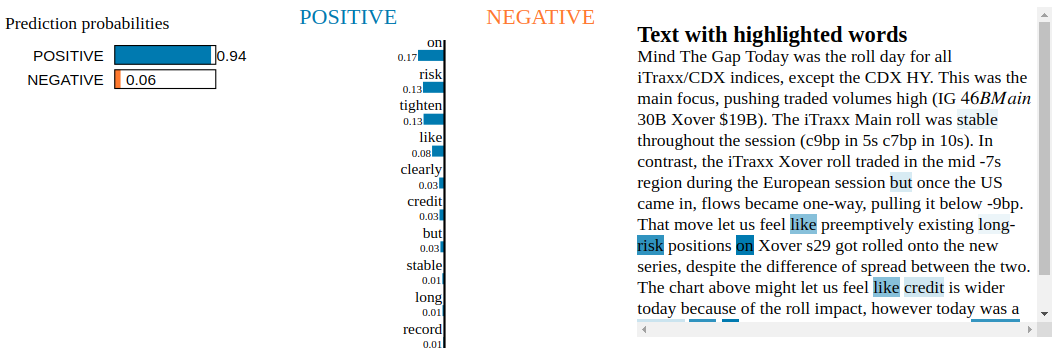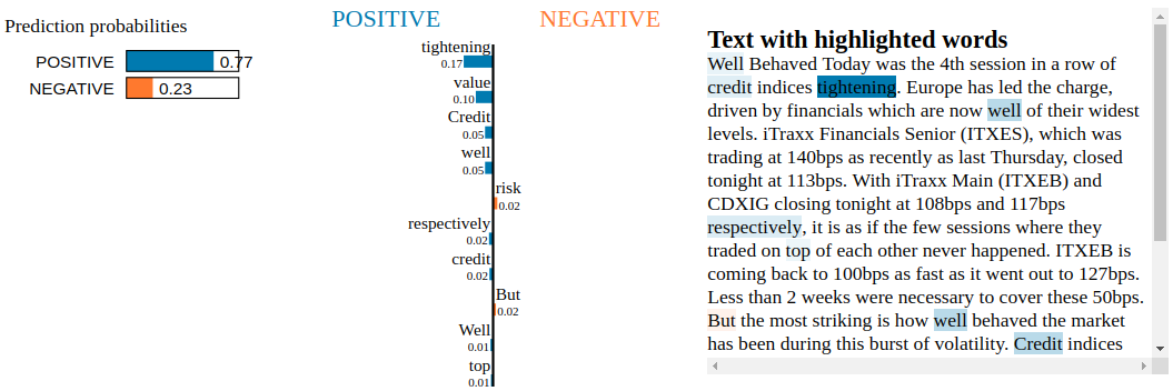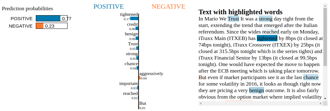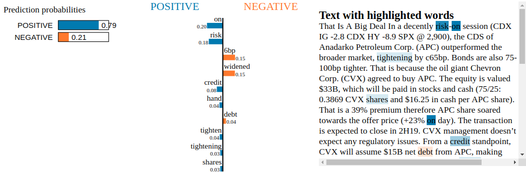 Conclusion: By inspecting the Snorkel Labeler with LIME, we are not able to find blatant clues of overfitting to irrelevant tokens. Not unexpected as the Snorkel Labeler sees only the text through the heuristics defined in the labeling functions (here, the financial jargon and common vocabulary encoded in VADER). It would be interesting to see how it goes when LIME is applied to a fine-tuned pre-trained end-to-end model such as BERT or XLNET.