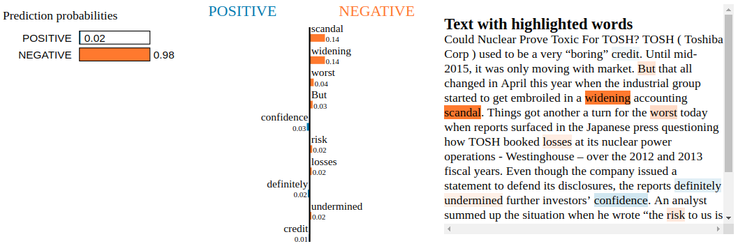 TL;DR Using LIME on the scikit-learn Random Forest in this blog, we saw that it totally overfitted irrelevant words such as tickers and people. In this blog, using LIME on the Snorkel Labeler, we observe that the Snorkel Labeler doesn’t suffer from this problem and that its labeling can be explained by a simple linear model of meaningful words.