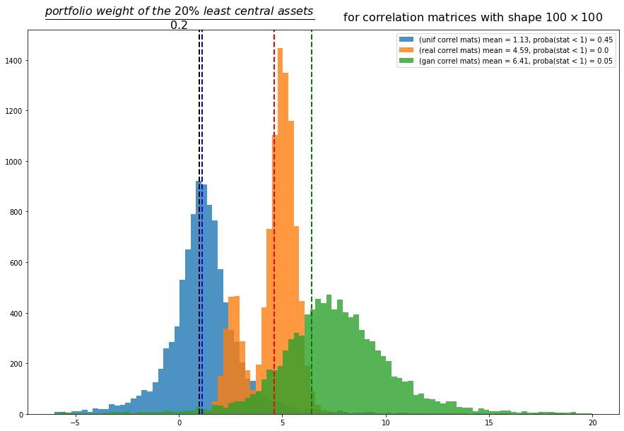 Concerning the correlation matrices generated by CorrGAN, they also show that, in practice, for realistic financial correlations, MVP and network-based portfolios tend to select the same assets. Only 5% of all the portfolios don’t overweight the 20% least central assets. But, otherwise, these 20% least central assets are even more overweighted than using the real empirical correlation matrices. We can see here that the GAN has not captured perfectly all the properties of the empirical matrices: The statistic derived to compare MVP and network-based portfolios doesn’t have a bimodal distribution when we use the synthetic matrices. Did the GAN failed to capture modes of the empirical distribution of financial correlation matrices? Correlations of stressed periods vs. normal periods? Need to investigate further using a cGAN fitting on stressed and normal periods. Any difference? Do we capture the bimodal distribution of this MVP centrality statistic?